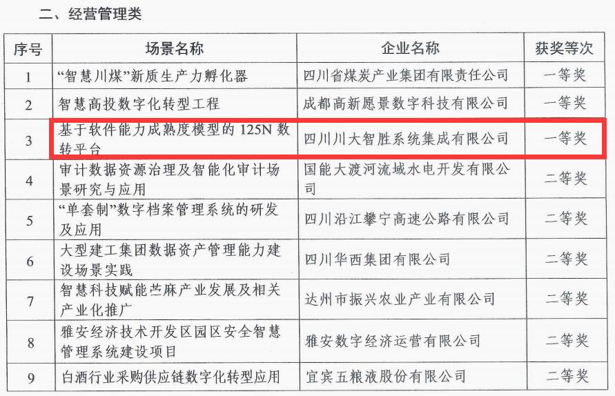近日,四川省国资委公布全省国资国企数字化转型优秀场景评选获奖名单,川投信产所属川投数科(全称:四川川投智胜数字科技有限公司,原全称:四川川大智胜系统集成有限公司)(以下简称“川投数科(原简称:智胜集成)”)基于软件能力成熟度模型的125N数转平台从全省国资国企推报的196个数字化转型场景中脱颖而出,荣膺经营管理类一等奖。