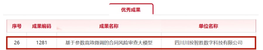 本次活动以“数据建模 赋智监管”为主题,围绕国资监管和企业管控共性问题,设立了12个赛道27个赛题。川投数科凭借自主研发的“基于参数高效微调的合同风险审查大模型”,从全国772个参赛模型作品中脱颖而出,获评“内部监督——风险识别预警”赛道“优秀成果”奖,成为四川省属国有企业中唯一获此荣誉的单位。